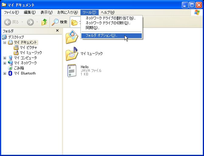 参考:エクスプローラの初期状態では、拡張子が表示されない様になっているので、保存後にファイル名を見ると拡張子がない状態(例:「Hello」)で表示されます。拡張子を表示するには、エクスプローラの「ツール」-「フォルダ オプション」を選択し、
