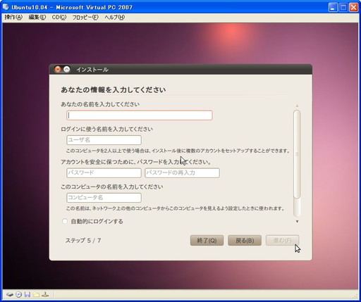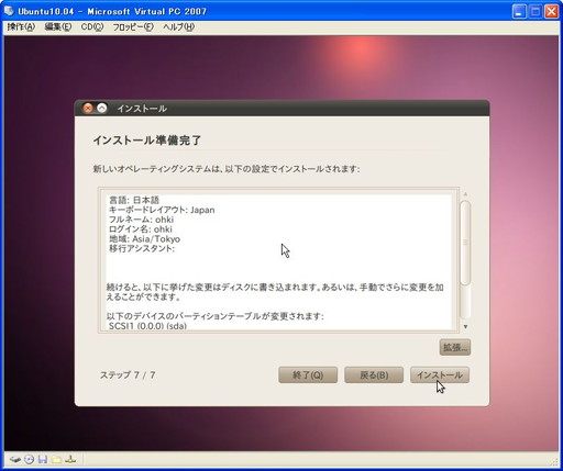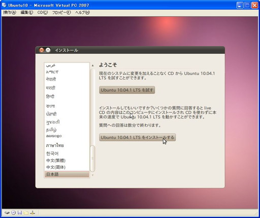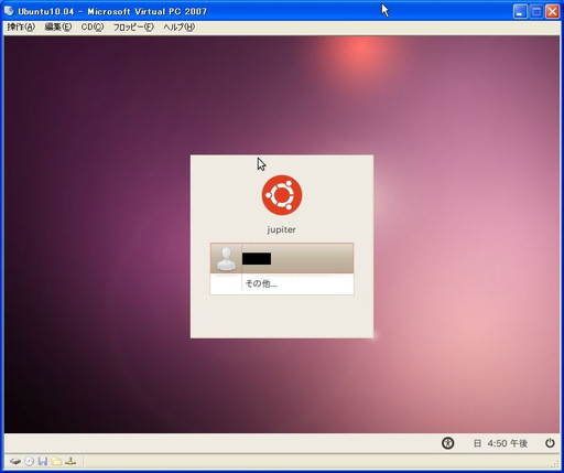 久々にLinux環境が必要になったので、Microsoft Virtual PCにUbuntu 10.04 LTSをインストールしてみました。