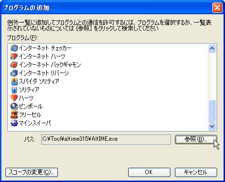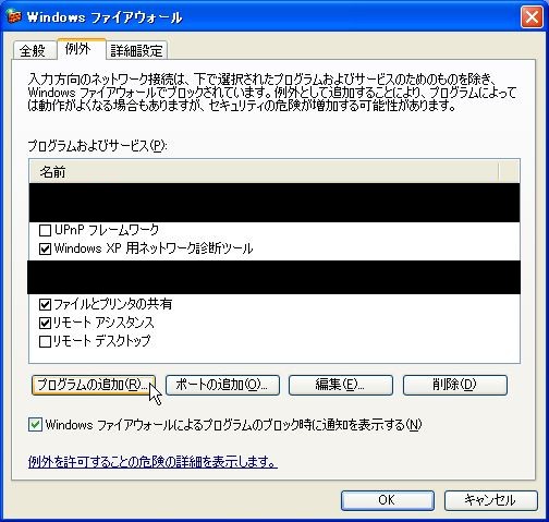 1.「コントロール パネル」-「Windowsファイヤウォール」を開き、例外タブを選択します。