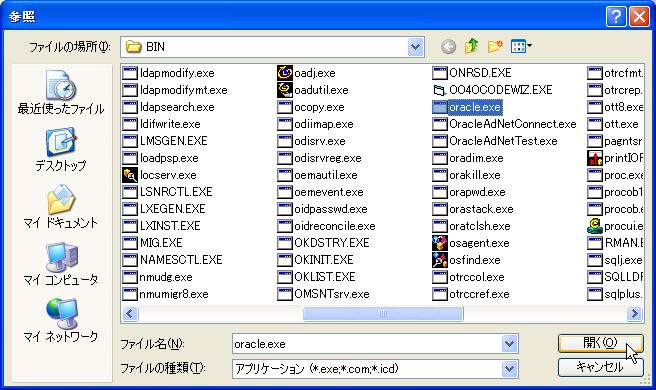 3.「C:¥oracle¥ora90¥BIN¥oracle.exe」を選択し、「開く」をクリックします。