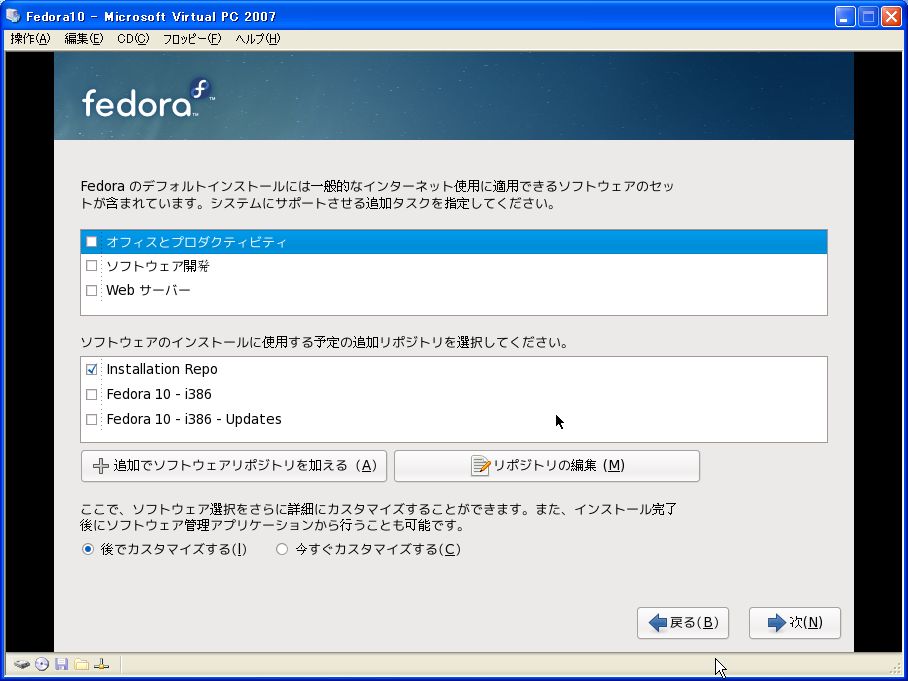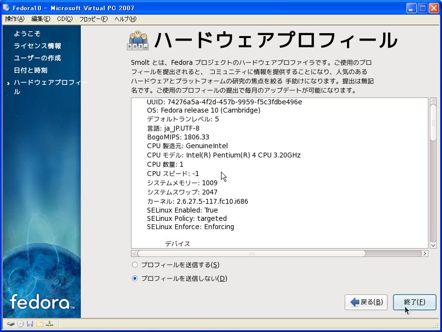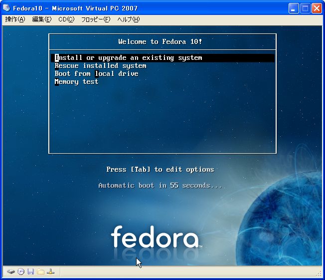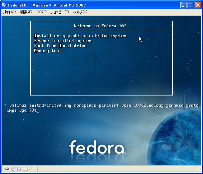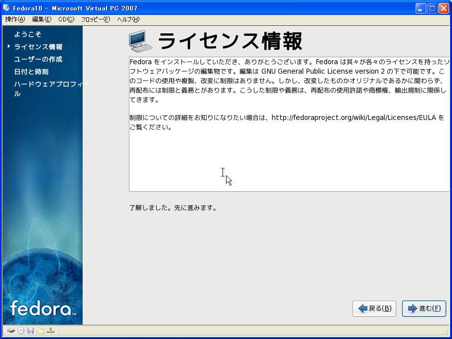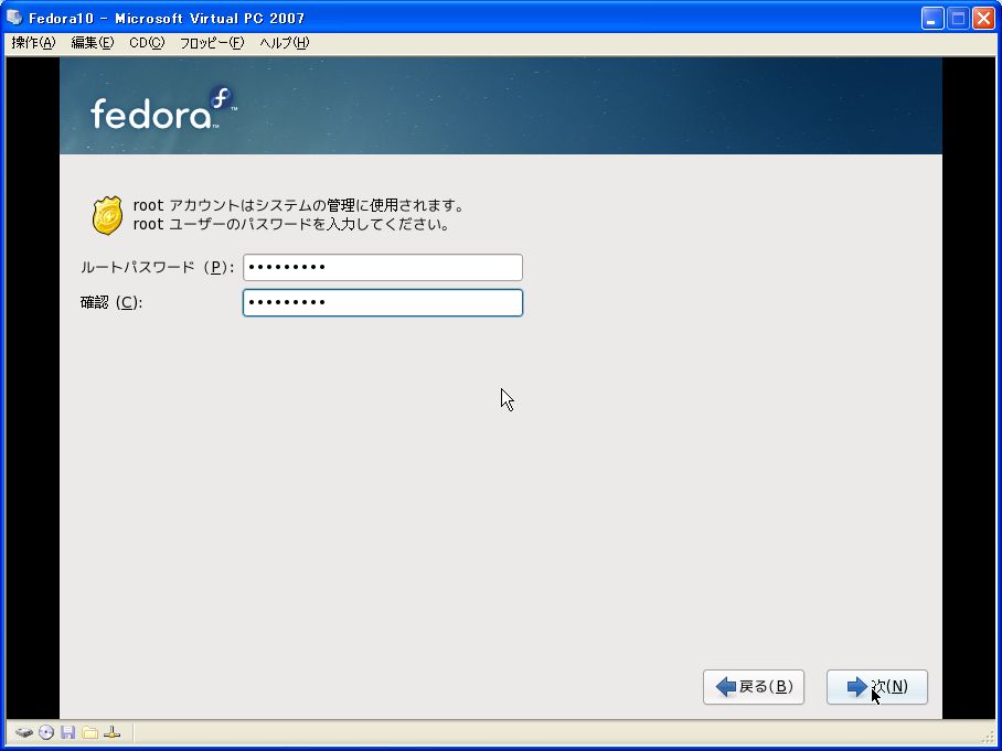 ※インストール後の感想:やはりMicrosoft Virtual PC上でFedora10を動かすととても遅いです、まあお手軽勉強目的という事で我慢するしかないですね。
