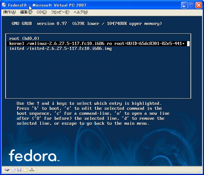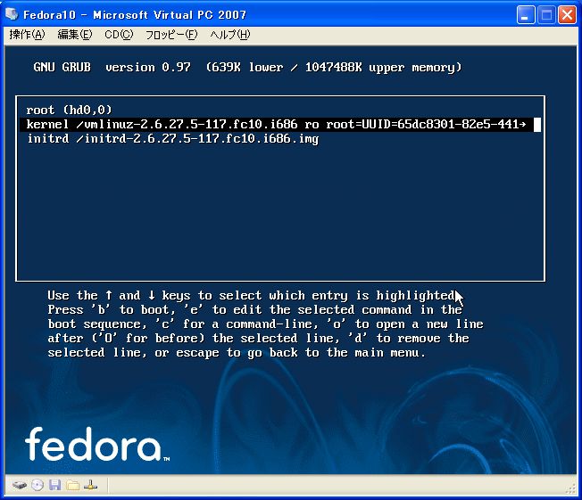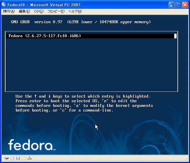 (Fedora10からgrubの起動画面は表示されなくなりました。表示する場合は、起動時に「Shift」キーを押したままにします。)
